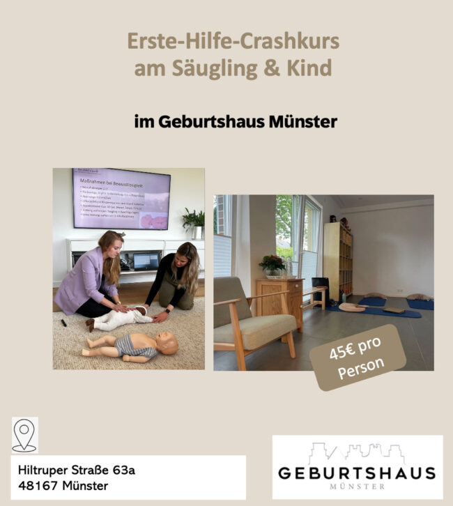 Möchtest du auch bei dem nächsten Erste-Hilfe-Crash-Kurs mitmachen? In einer Kleingruppe lernst du alles Wichtige zu den Themen: Notfallapotheke Verschlucken Verletzungen durch Verbühungen / Verbrennungen Kinderkrankheiten Notfälle im Kindesalter wie Vergiftung, Schädelhirntrauma und SIDS (plötzlicher Säuglingstod) erste Hilfe am Kind, u.a. Reanimationskette und Herzdruckmassage Nächster Termin: 11.07.2026 von 10-13 Uhr Max. Anzahl an Teilnehmenden: 10…